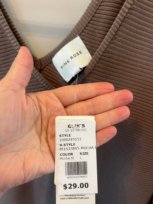 Pink Rose Ribbed VNeck Top Women’s Size Large Mocha