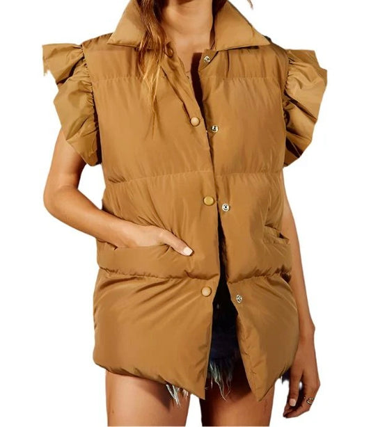 Ruffle Sleeve Puffer Vest Women’s Small Tan
