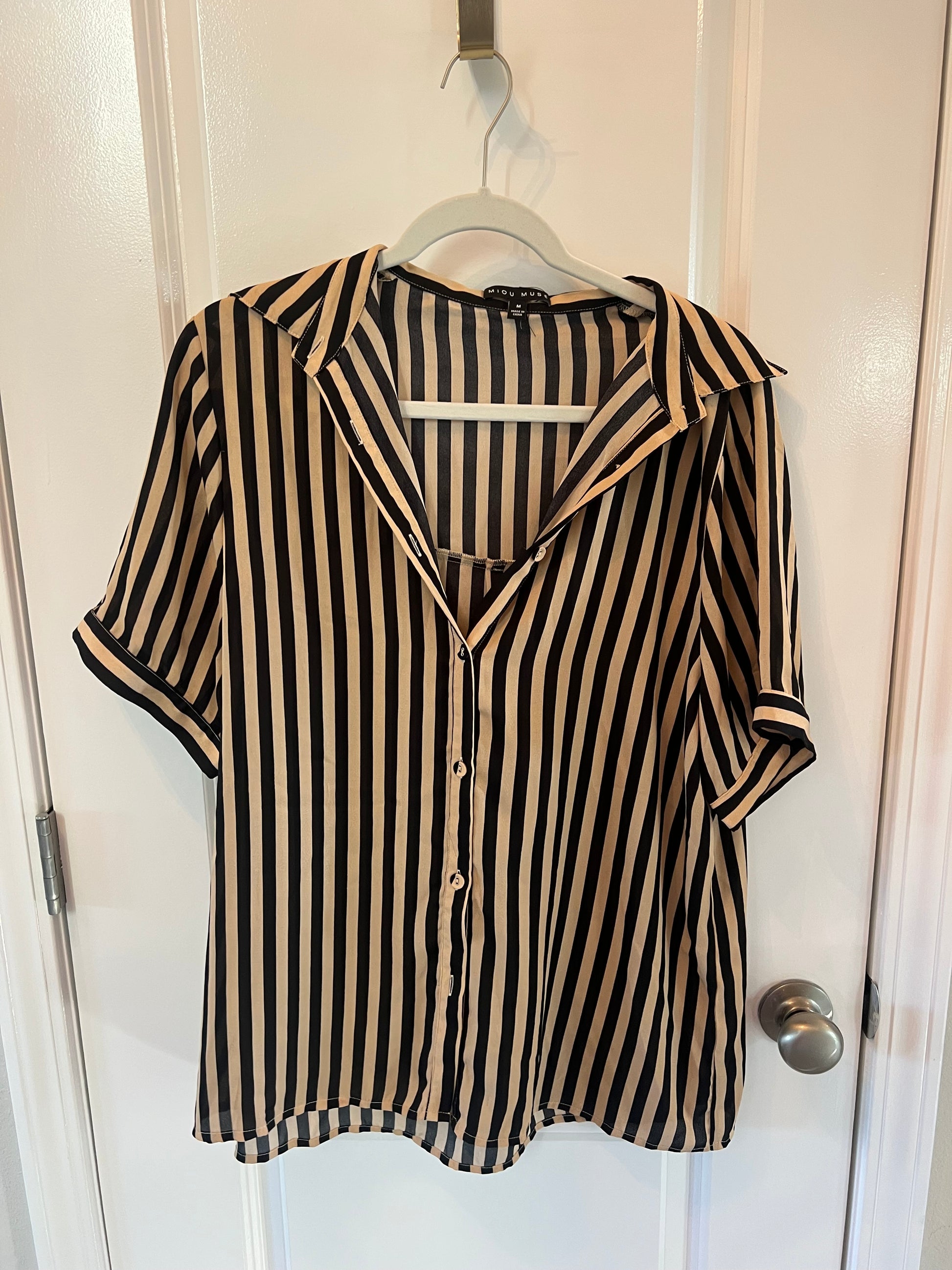 Miou Muse Stripe Button Front Short Sleeve Top Women’s Size Medium Tan